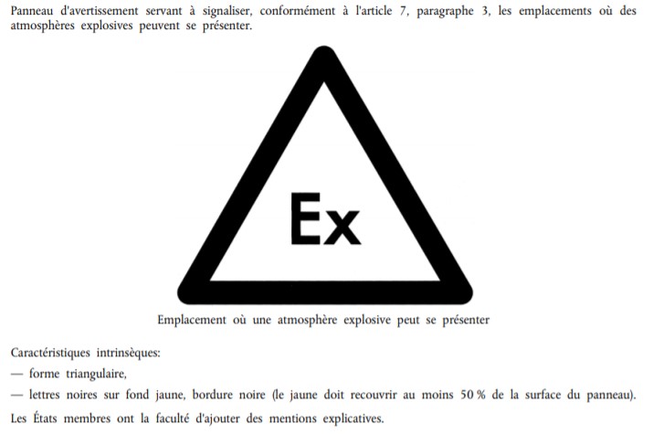 La directive ATEX précise notamment les obligations d’affichage sur les lieux de travail, pour signaler aux travailleurs les emplacements dangereux (zones ATEX).